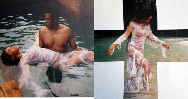 The images show Beyonce and Jay Z mimicking traditional Christian imagery. One of the images shows Beyonce dressed as if she were Jesus and there’s a cross around her, while the second image shows Jay Z as John The Baptist, baptizing Beyonce.